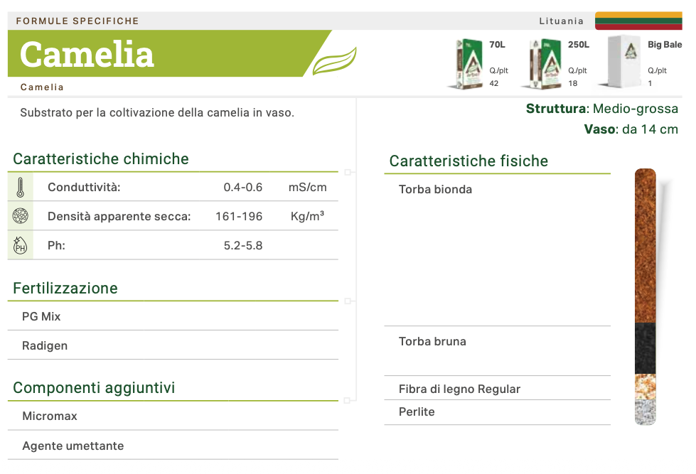 Substrato ideale per la coltivazione della camelia in vasi di medie dimensioni. Realizzato con torba bionda (70%), torba nera (20%) e perlite (10%), offre un’eccellente combinazione di ritenzione idrica e aerazione delle radici. Proveniente dai Paesi Baltici, presenta una struttura medio-grossa, un pH ottimale tra 5,2 e 5,8 e una conducibilità bilanciata (0,4-0,6 mS/cm). Questo substrato è progettato per soddisfare le esigenze specifiche della camelia, garantendo una crescita rigogliosa e una fioritura di qualità.