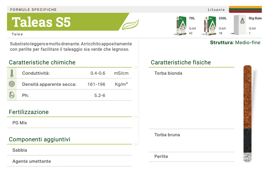 Substrato leggero e altamente drenante, specificamente sviluppato per la coltivazione di talee sia verdi che legnose. Composto da torba bionda (65%), torba nera (25%), perlite (10%) e sabbia, assicura un’eccellente aerazione e una gestione ottimale dell’umidità. Proveniente dai Paesi Baltici, presenta un pH compreso tra 5,2 e 6,0 e una conducibilità moderata (0,4-0,6 mS/cm). Questo substrato è ideale per favorire il rapido attecchimento delle radici e lo sviluppo sano delle talee, rendendolo perfetto per coltivazioni professionali.