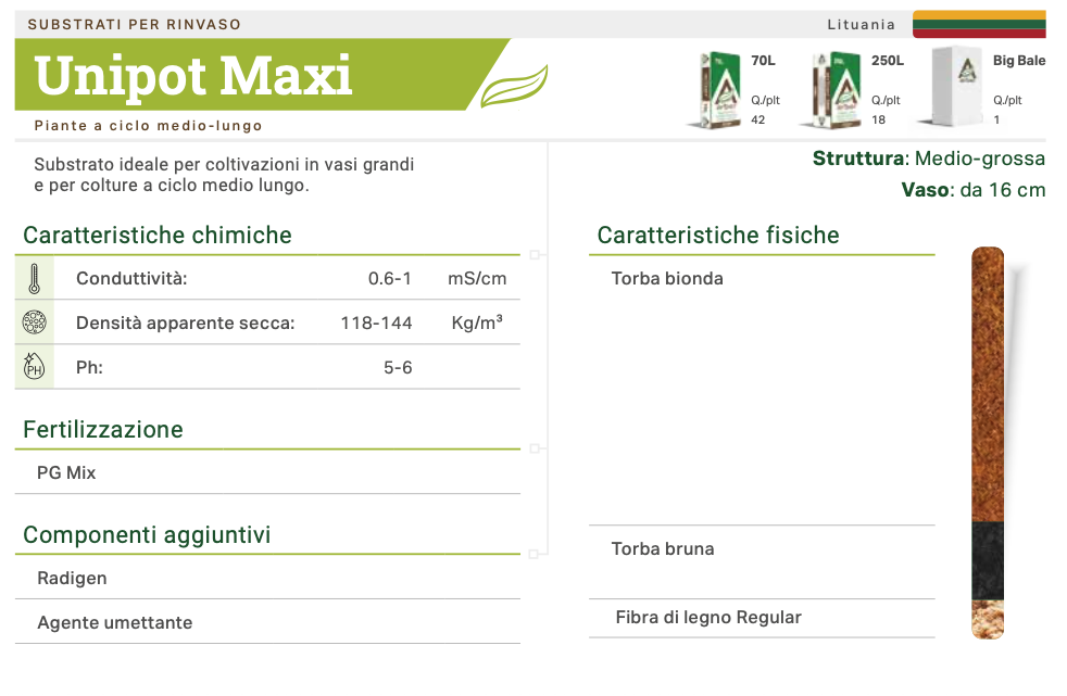 Substrato sviluppato per il rinvaso di piante a ciclo medio-lungo, ideale per vasi di grandi dimensioni (a partire da 16 cm di diametro). Realizzato con torba bionda (80%) e torba nera (20%) provenienti dai Paesi Baltici, è arricchito con 60 kg/m³ di argilla per una maggiore stabilità e ritenzione idrica. La struttura medio-grossa, un pH compreso tra 5,0 e 6,0 e una conducibilità bilanciata tra 0,6 e 1,0 mS/cm lo rendono ideale per supportare una crescita vigorosa e duratura. Include fertilizzanti bilanciati (NPK 14-16-18) per favorire uno sviluppo uniforme delle piante.